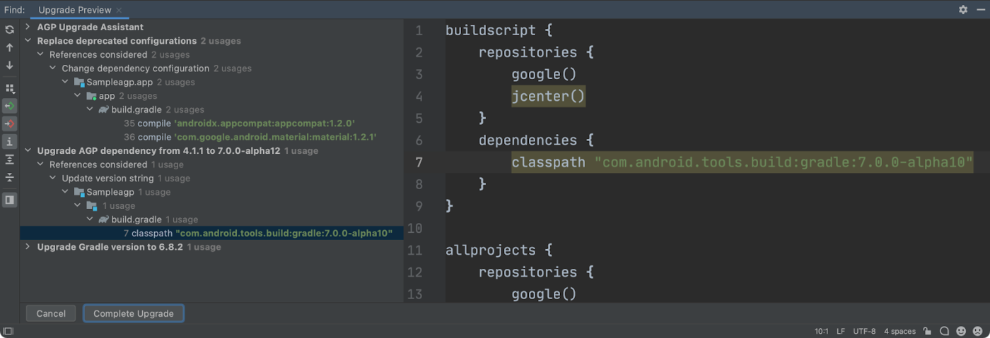 A volte aggiornare il progetto della propria app all’ultima versione può essere complicato: per risolvere questo problema, Google ha aggiunto in Android Studio 4.2 un nuovo upgrade assistant che rende più facile la migrazione del progetto e l’utilizzo delle ultime API Android Gradle Plugin (AGP).
