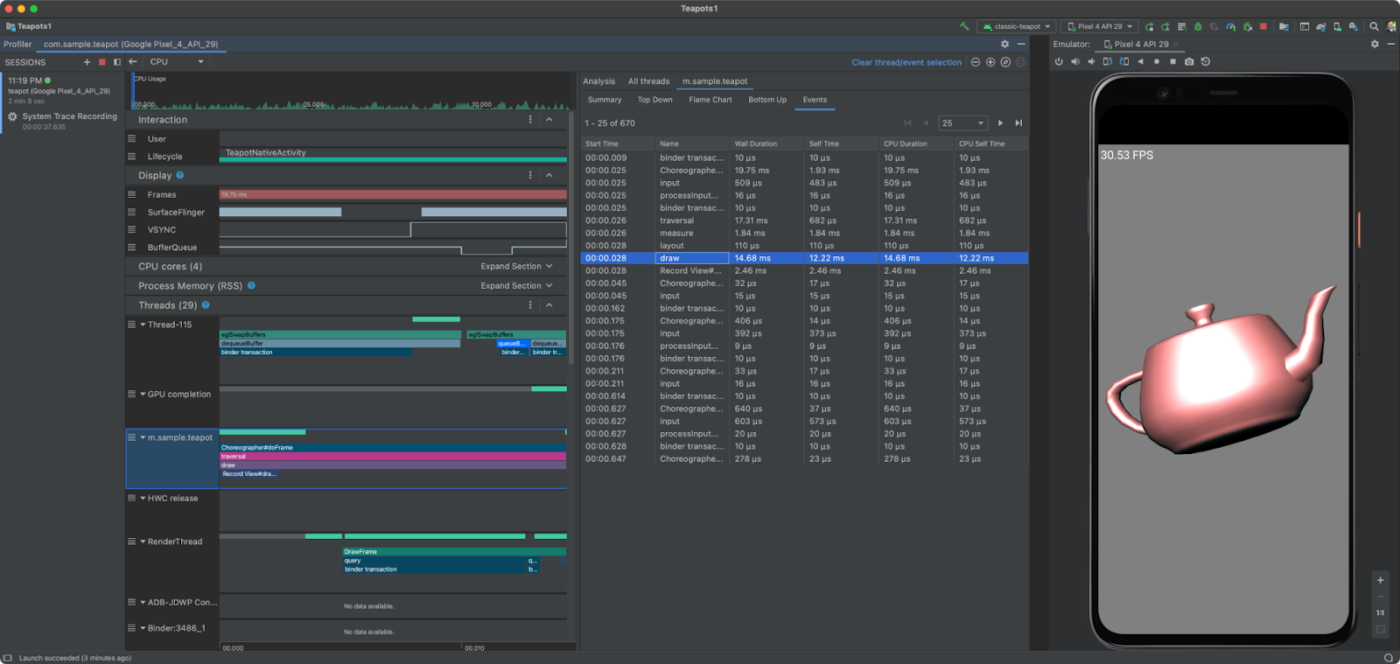 Per rifinire la performance del proprio progetto, con questa versione di Android Studio System Trace ha ora una nuova tabella degli eventi. Con questa nuova visualizzazione tabella è possibile vedere: BufferQueue, contatori di memoria RSS e frequenza dei core della CPU, il tutto in un’interfaccia utente compatta.