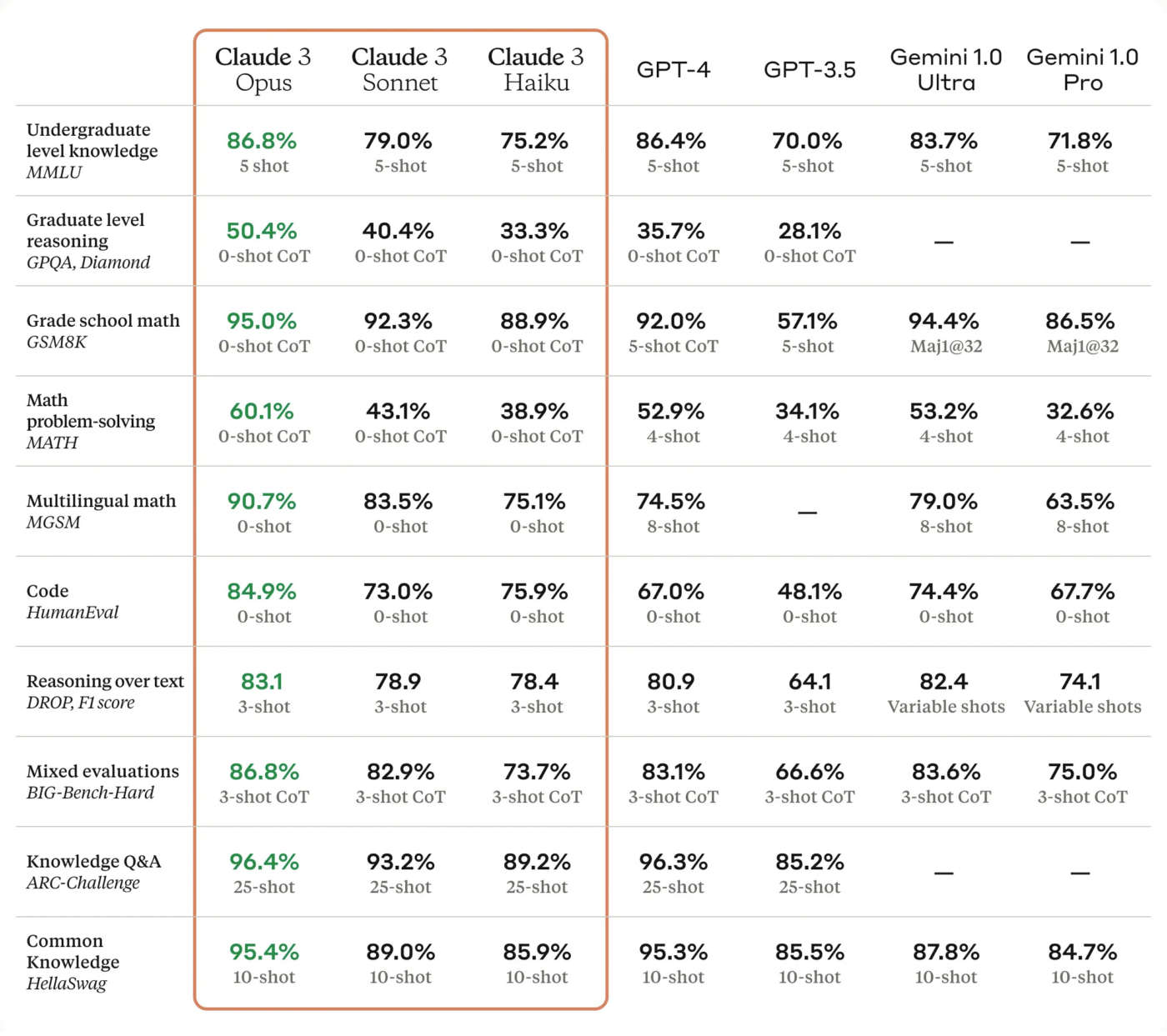 Anthropic ClaudeAnthropic ha pubblicato una serie di confronti tra i modelli Claude 3 e quelli di altre aziende protagoniste del campo dell’intelligenza artificiale, su diversi benchmark.