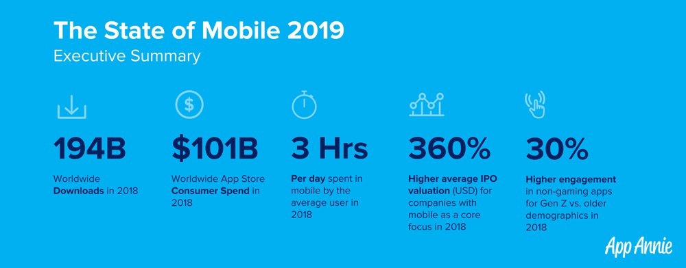 Gli utenti hanno scaricato 194 miliardi di app nel 2018, un numero impressionante. Altrettanto notevole è che hanno speso 101 miliardi di dollari negli app store. E hanno speso una media di tre ore al giorno sui dispositivi mobili.