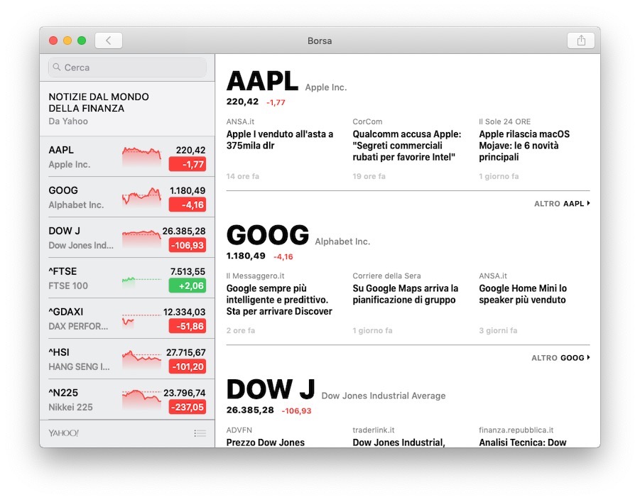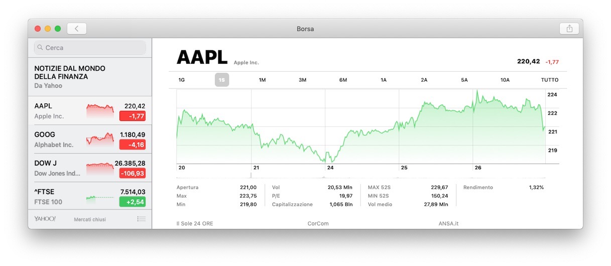 Su Borsa non c’è molto altro da dire se non che, per l’appunto, ci consente di seguire l’andamento dei titoli. Anch’essa è un’app proveniente da iOS e al suo debutto sul Mac.