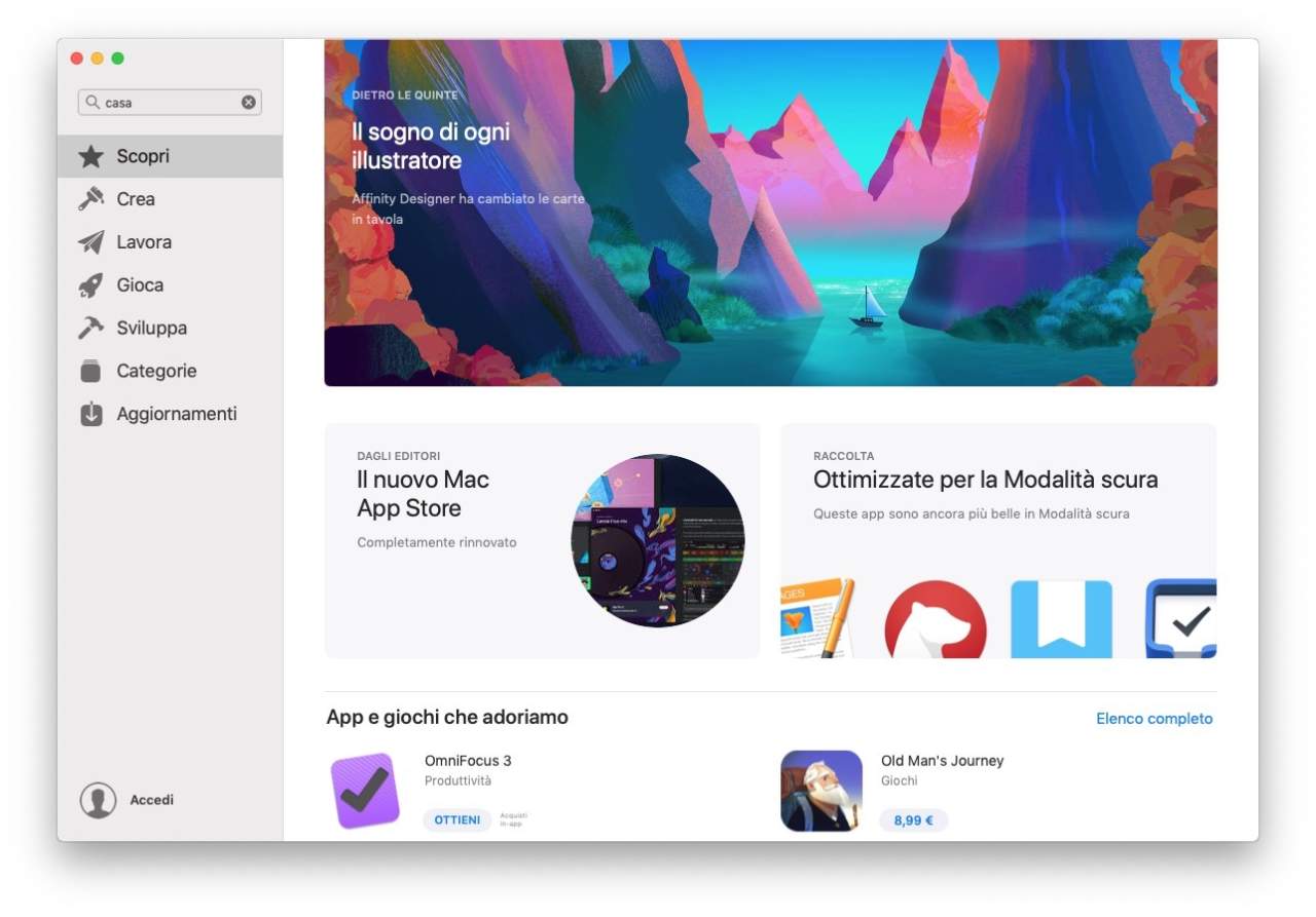 Abbiamo ora la scheda Scopri, con le applicazioni scelte ed evidenziate dalla redazione del Mac App Store. Poi quattro sezioni dedicate, Crea, Lavoro, Gioca e Sviluppa, per trovare app collegate ai vari tipi di attività. In Categorie possiamo sfogliare l’intero catalogo di applicazioni per Mac disponibili sullo Store. E poi c’è la consueta scheda dedicata agli Aggiornamenti.