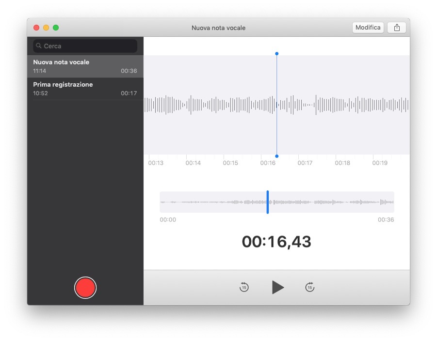 Registrare una nota vocale è semplicissimo: basta un clic sul pulsante rosso circolare, per far partire la registrazione. Una volta terminata la registrazione, è possibile non solo riascoltarla, ma anche modificarla. La casella di ricerca ci consente di trovare una nota vocale nella lista di quelle registrate.