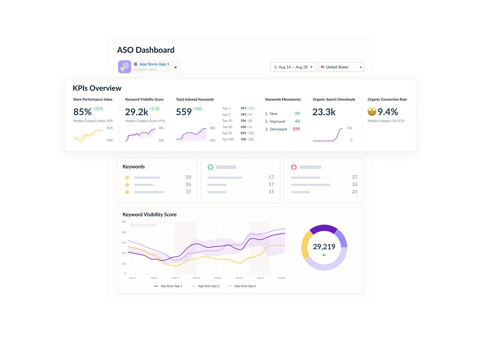 La dashboard ASO della piattaforma fornisce i principali KPI e le metriche per misurare il successo dell’app sugli app store. Offre i trend di popolarità delle parole chiave, informazioni di marketing sulla visibilità dell’app e strumenti di ottimizzazione della pagina dell’app. Come altri ambiti della soluzione, molti tool sono automatizzati.