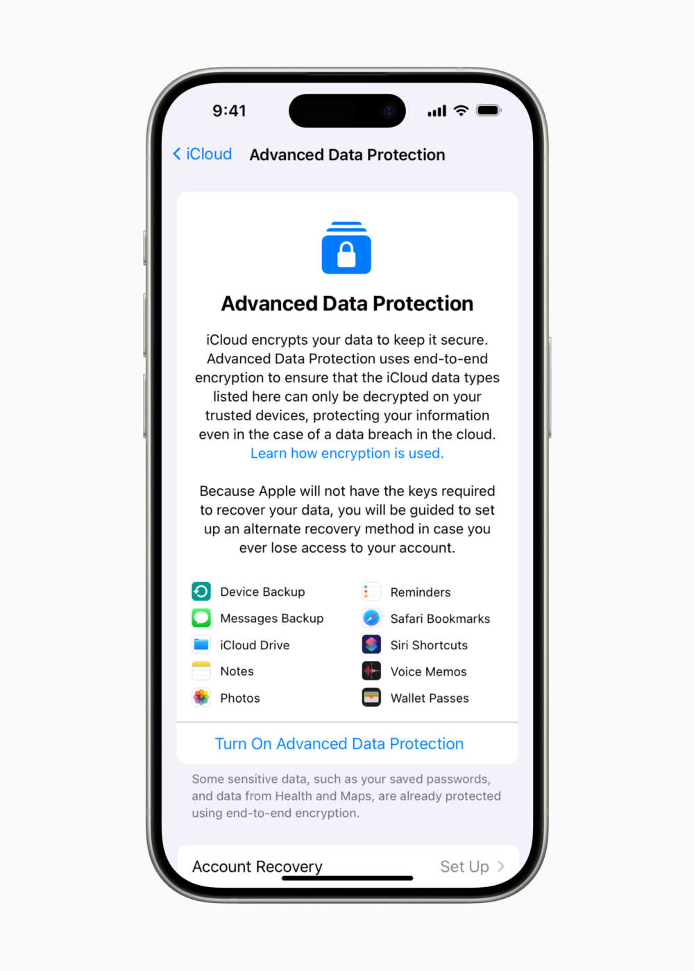 Con la Protezione Avanzata dei Dati per iCloud, che utilizza la crittografia end-to-end per fornire il più alto livello di sicurezza dei dati cloud di Apple, gli utenti possono scegliere di proteggere ulteriormente dati importanti su iCloud anche in caso di violazione dei dati. Di default iCloud protegge già 14 categorie di dati sensibili con la crittografia end‑to‑end, tra cui le password nel Portachiavi iCloud e i dati dell’app Salute. Per chi attiva la Protezione Avanzata dei Dati per iCloud, il numero totale delle categorie di dati protette con l’utilizzo della crittografia end‑to‑end sale a 23, tra cui Backup iCloud, Note e Foto.