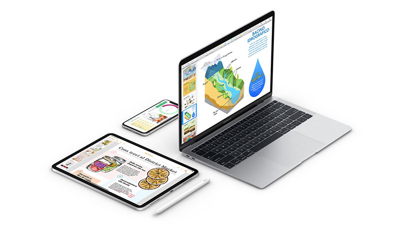 Le tre app sono disponibili sia per Mac che per iPhone e iPad; grazie alla versione web di iWork la suite di produttività Apple può anche essere eseguita, con alcuni limiti, sui Pc.