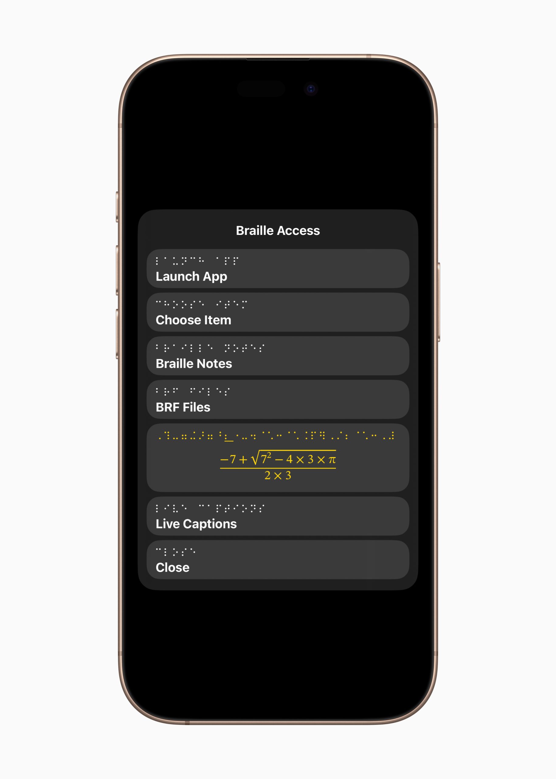 Braille-AccessBraille Access è una nuova esperienza che trasforma iPhone, iPad, Mac e Apple Vision Pro in un registratore di note braille completo e profondamente integrato nell’ecosistema Apple. Grazie a un app launcher integrato, gli utenti possono aprire facilmente qualsiasi app digitando con Braille Screen Input o con un dispositivo braille collegato. Con Braille Access, gli utenti possono prendere rapidamente appunti in formato braille ed eseguire calcoli utilizzando il Nemeth Braille, un codice braille spesso utilizzato nelle classi di matematica e scienze. Gli utenti possono aprire i file Braille Ready Format (BRF) direttamente da Braille Access, sbloccando un’ampia gamma di libri e file precedentemente creati su un dispositivo braille per prendere appunti. Inoltre, una forma integrata di Live Captions consente agli utenti di trascrivere le conversazioni in tempo reale direttamente sui display braille.