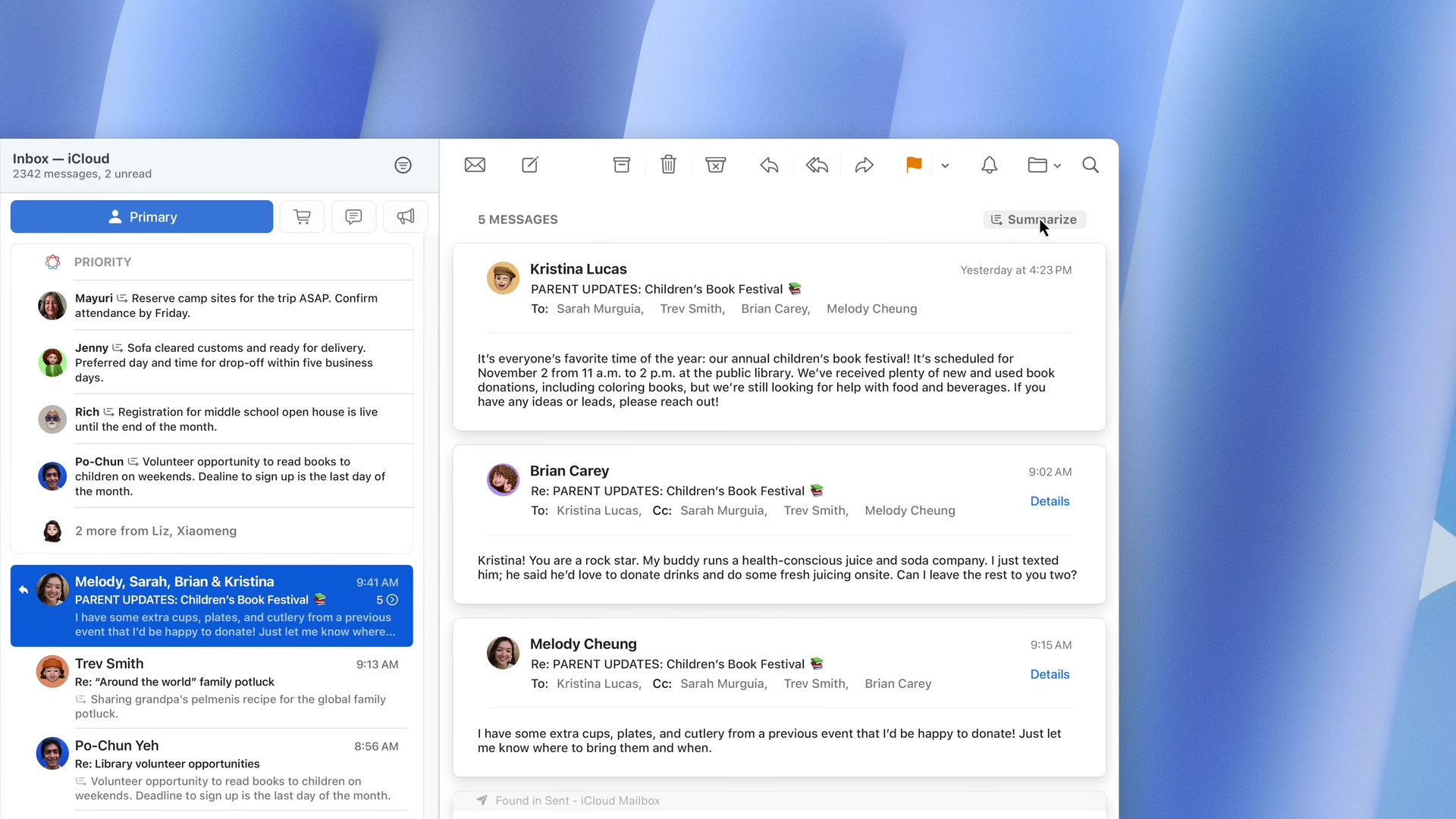 Tenere sotto controllo le e-mail non è mai stato così facile. Priority Messages, una nuova sezione nella parte superiore della posta in arrivo di Mail, mostra le e-mail più urgenti, come un invito a pranzo in giornata o una carta d’imbarco. In tutta la casella di posta, gli utenti possono vedere i riepiloghi senza dover aprire un messaggio e, per le discussioni più lunghe, possono toccare o fare clic su Summarize per visualizzare i dettagli più importanti. Inoltre, Smart Reply fornisce suggerimenti per una risposta rapida e identifica le domande contenute in un’e-mail per garantire una risposta completa.