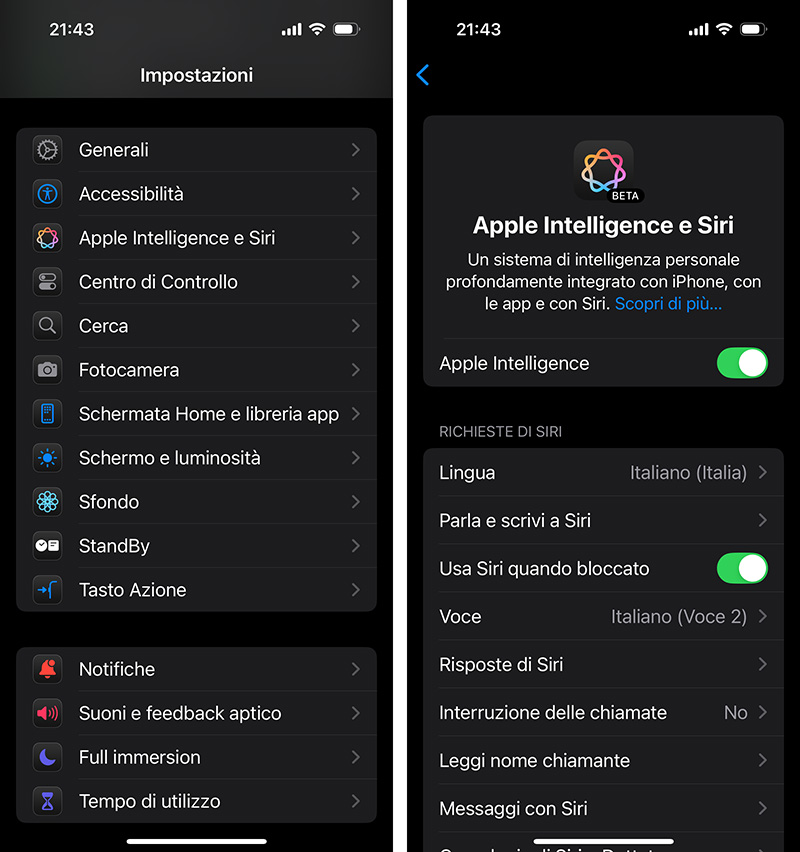 Su iPhone, per accedere alla pagina di configurazione, basta aprire Impostazioni e toccare Apple Intelligence e Siri: con lo switch di fianco alla voce Apple Intelligence possiamo disattivarla o attivarla (nel caso non lo fosse già, o fosse stata disattivata in precedenza).