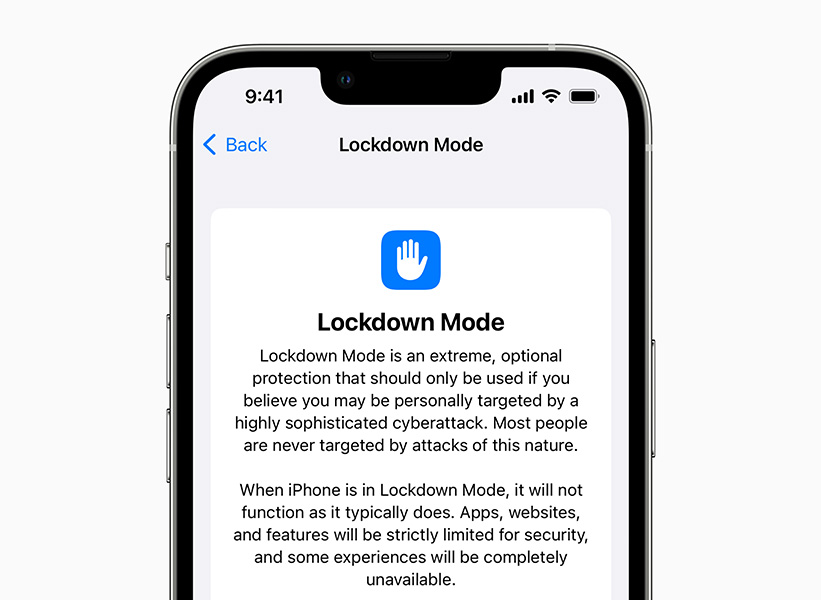L’attivazione della modalità di isolamento in iOS 16, iPadOS 16 e macOS Ventura rafforza ulteriormente le difese del dispositivo e impone stretti limiti ad alcune funzioni, riducendo in modo netto la superficie di attacco che potenzialmente potrebbe essere sfruttata da uno spyware mercenario mirato.