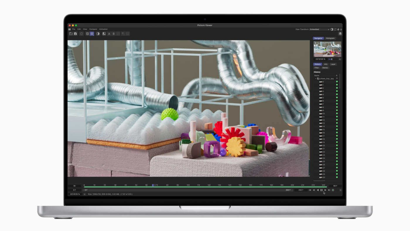 - Il rendering in Maxon Redshift è fino a 5,3 volte più veloce rispetto al più scattante MacBook Pro con processore Intel, e fino a 2,5 volte più rapido che su MacBook Pro 16″ con M1 Max.