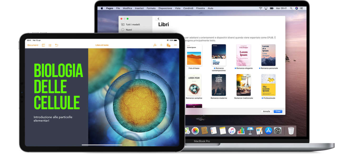 Pages consente di creare ebook non solo dal Mac, ma anche con iPad, iPhone, e iCloud.com. Il software offre funzionalità di creazione di ePub e permette di pubblicare i libri direttamente su Apple Books. Pages, così come le altre applicazioni della suite di produttività di Apple, offre inoltre funzioni di condivisione e collaborazione tramite la piattaforma iCloud.