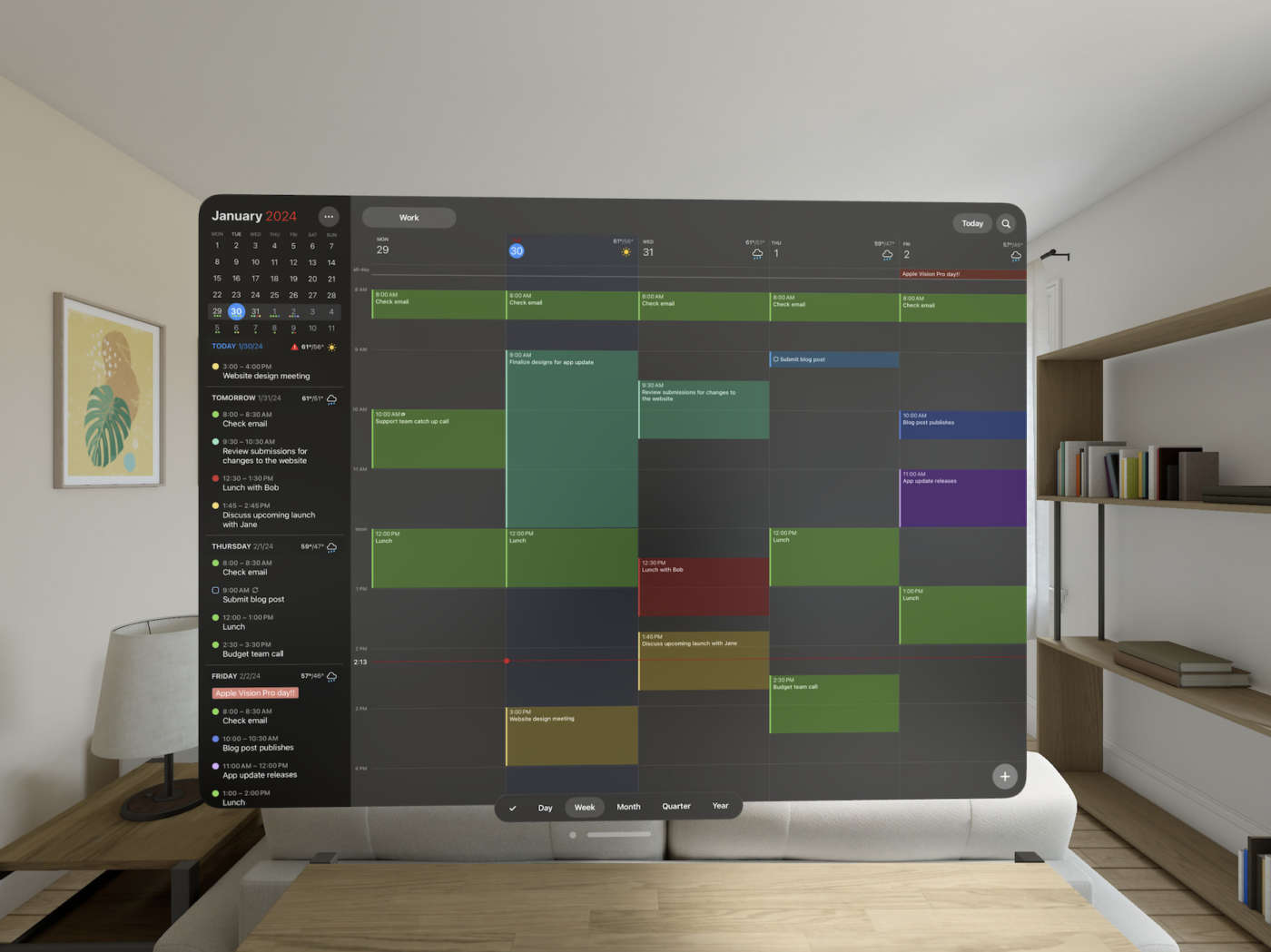 Se l’utente vuole visualizzare un singolo giorno sulla sinistra e tenere traccia dell’intera settimana sulla destra, può farlo in Fantastical per Apple Vision Pro. Naturalmente, dato che ogni calendario ha la propria finestra, è possibile avvicinarle o allontanarle e ridimensionarle per adattarle alle proprie esigenze.