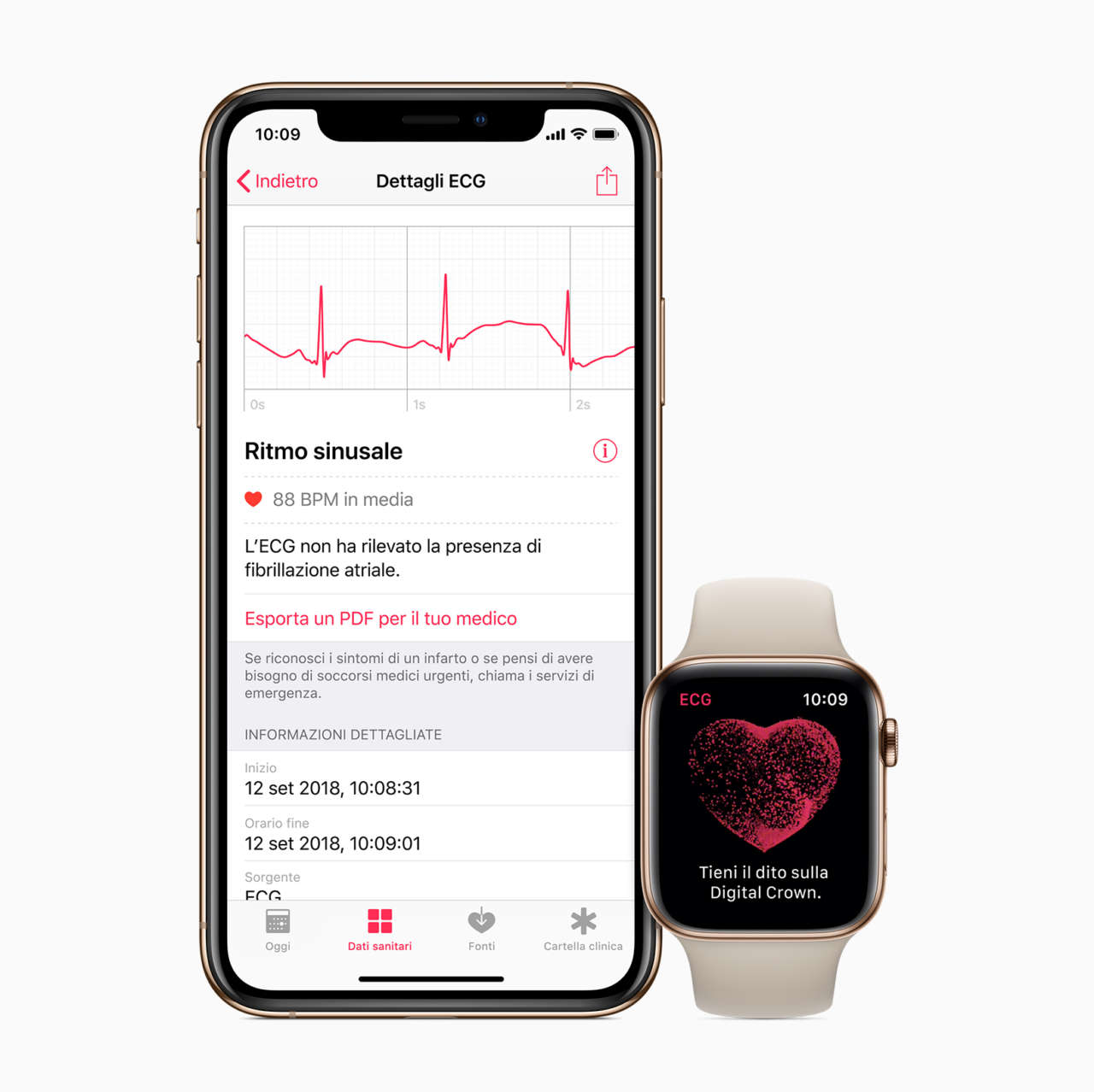 A rendere possibili le nuove funzionalità, concorrono l’app e le caratteristiche hardware di Apple Watch Series 4. Nella Corona Digitale e nel cristallo posteriore su Apple Watch Series 4 vi sono dei nuovi elettrodi integrati. Questi interagiscono con l’app ECG per permettere ai clienti di eseguire un elettrocardiogramma simile a un ECG a singola derivazione.