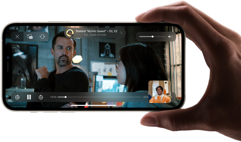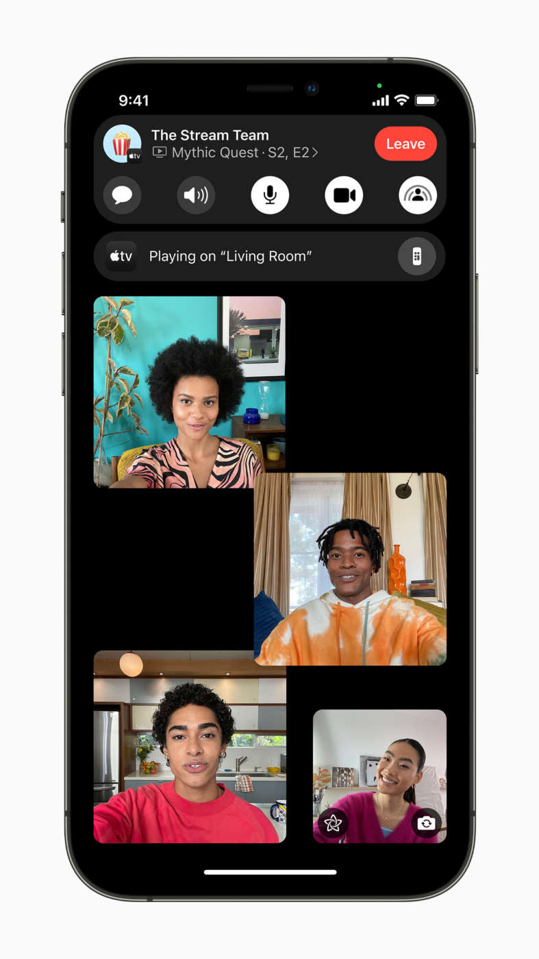 SharePlay si estende anche alla Apple TV, così gli utenti possono guardare spettacoli o film su un grande schermo mentre si collegano tramite FaceTime, e SharePlay manterrà la riproduzione di tutti in sincronia. Disney+, ESPN+, HBO Max, Hulu, MasterClass, Paramount+, Pluto TV, TikTok, Twitch e molti altri fornitori di contenuti stanno integrando SharePlay nelle loro app, creando modi completamente nuovi di connettersi e condividere esperienze.