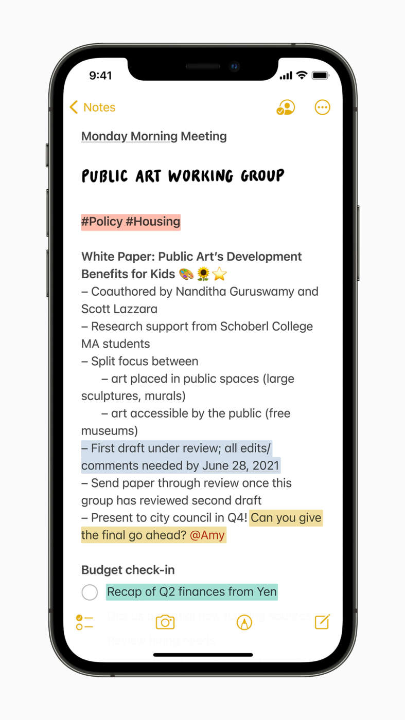 L’app Note aggiunge i tag creati dall’utente che rendono facile categorizzare rapidamente le note. Le menzioni permettono ai partecipanti alle note condivise di notificarsi a vicenda gli aggiornamenti importanti. Una nuova vista Attività mostra inoltre la cronologia recente di una nota condivisa.
