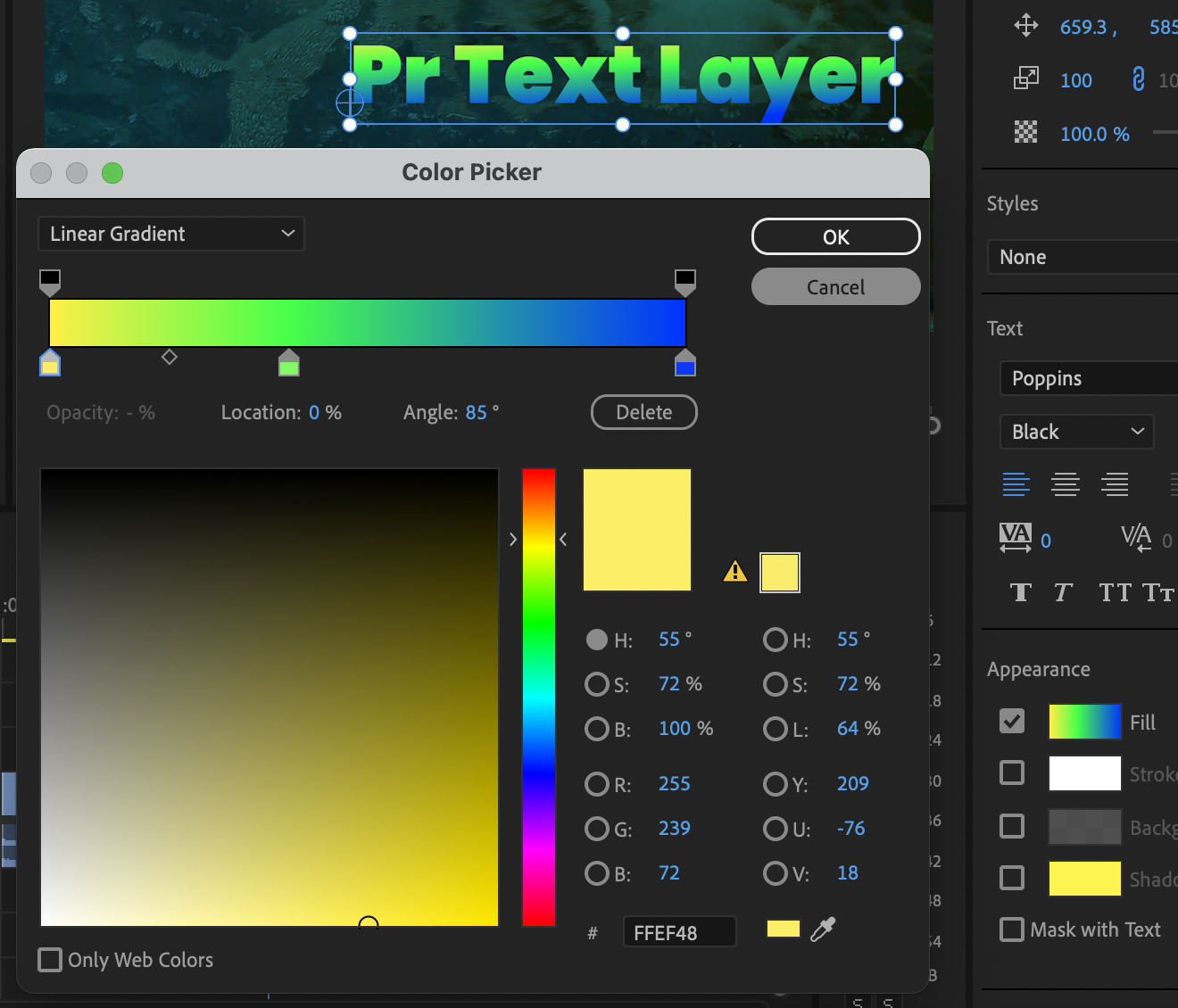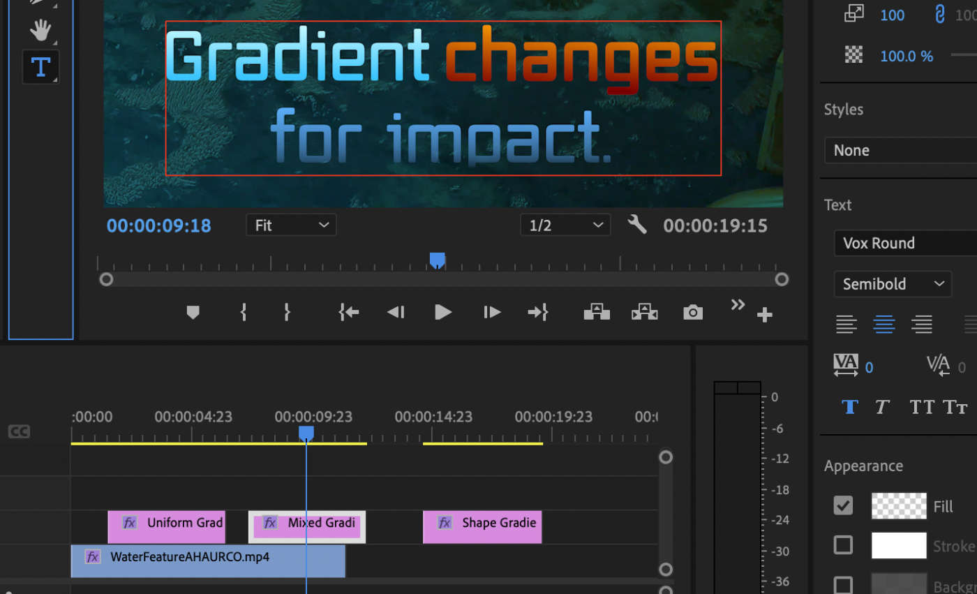 Precedentemente disponibili solo con il toolset Legacy Titler, le sfumature per il testo fanno ora parte dei nuovi strumenti Titolazione nel pannello Grafica essenziale. Gli utenti possono applicare sfumature per aggiungere lucentezza alle lettere o effetti colorati per testo e titoli. Per alcuni stili di forte impatto, gli utenti possono anche combinare diverse sfumature.