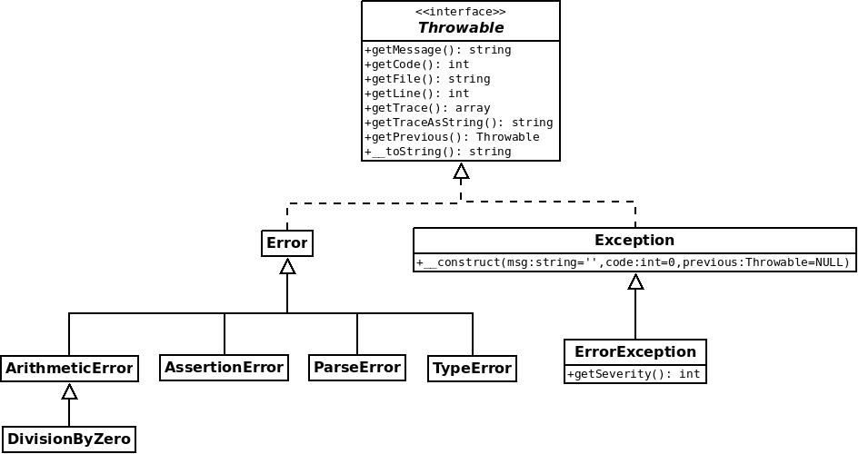 Il PHP 7 offre una nuova gerarchia delle eccezioni basata sull’interfaccia Throwable. Le eccezioni generate sono di tipo Error o Exception. Gli Error sono eccezioni generate dall’interprete PHP mentre le Exception vengono generate a livello applicativo. Tra gli Error ci sono anche eccezioni del tipo ParseError, che consentono di rilevare errori di parsing del codice PHP. Questo è un aspetto interessante del PHP 7 che consente di personalizzare e gestire errori a run-time di qualsiasi tipo.