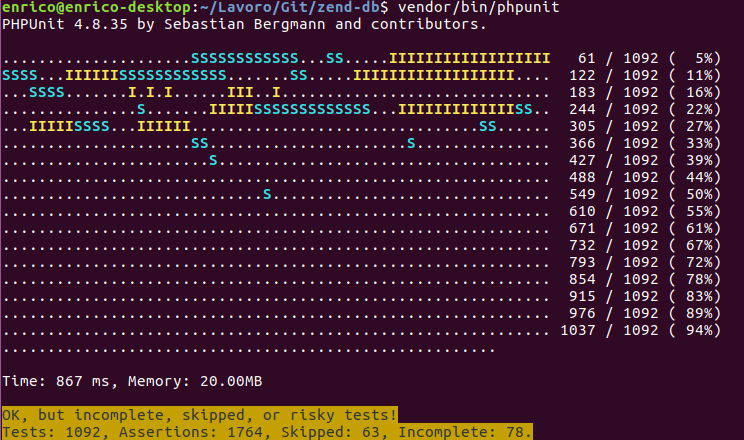 Un altro aspetto importante in un progetto software sono i test unitari (e funzionali). Il modo migliore per sviluppare un progetto è quello di testare ogni riga di codice che viene scritta. In questo modo è possibile far crescere il progetto avendo delle solide fondamenta in grado di rilevare se la modifica o aggiunta prodotta non vada a “rompere” le funzionalità pre-esistenti. I test unitari consentono di testare porzioni isolate di codice mentre quelli funzionali consentono di testare le interazioni tra codici diversi. In PHP un altro standard de facto per i test è PHPUnit.