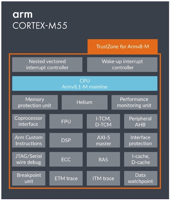 Arm afferma che il Cortex-M55 offre un aumento fino a 15 volte nelle prestazioni relative al machine learning e un aumento di cinque volte nelle prestazioni DSP, al contempo con una maggiore efficienza, rispetto alle precedenti generazioni Cortex-M.