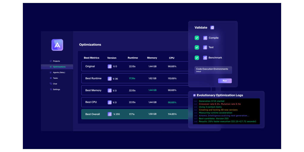 Artemis is the first AI platform to integrate proprietary Agentic AI and Evolutionary Algorithms into an automated workflow that seamlessly integrates with existing developer tools. Language-agnostic, Artemis optimizes legacy, developer-written, and AI-generated code, whether deployed in the cloud, on-prem, or on specialized hardware.