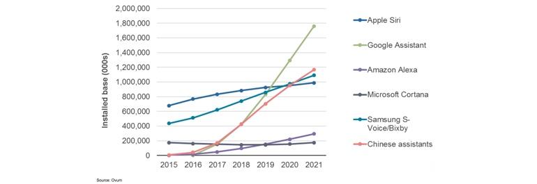 Per dare qualche cifra, Ovum ritiene che nel 2021 la distribuzione degli assistenti vocali vedrà Google Assistant al comando con il 23 percento circa di mercato, seguito da un terzetto posizionato intorno al 13-15 percento e composto dagli assistenti cinesi, da Bixby e da Siri. Più distanziati, intorno al 2-4 percento, Amazon Alexa e Microsoft Cortana.
