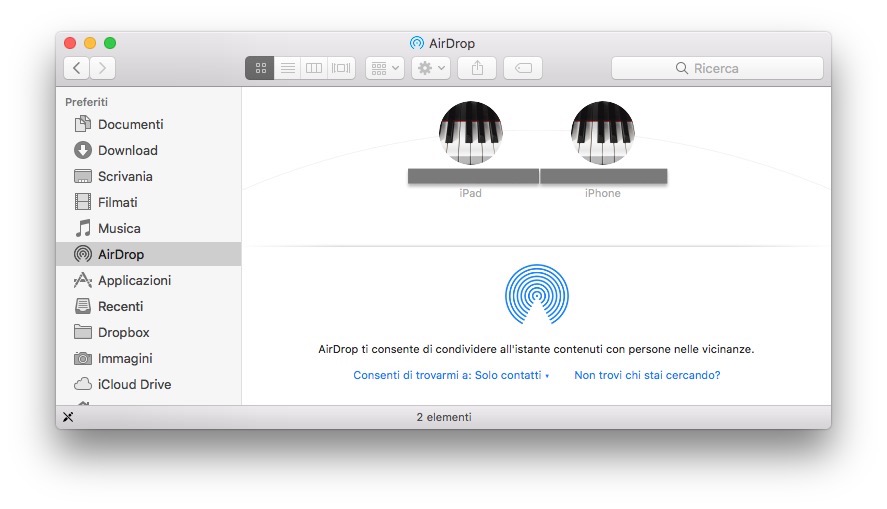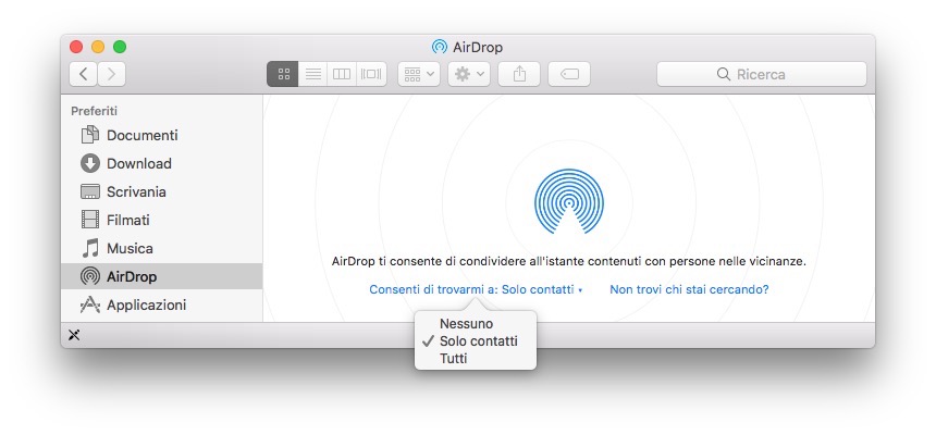 In entrambi i casi si apre una finestra AirDrop. In basso nella finestra è presente il tasto Consenti di trovarmi a:. Fai clic su di esso per accedere alle tre opzioni che abbiamo visto anche per iOS. Le tre opzioni sono: Nessuno, Solo contatti, Tutti. Le abbiamo descritte nel precedente articolo e qui valgono le stesse considerazioni.