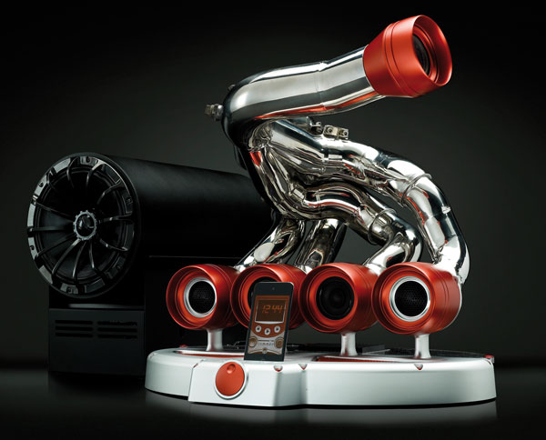 Ogni docking station è un’opera unica, ciascuna di esse viene infatti assemblata secondo un processo artigianale, nella migliore tradizione del made in Italy, che unisce un autentico gruppo di scarico di un motore a 8, 10 o 12 cilindri a un corpo ricavato da un blocco di alluminio pieno. Il dock per iPhone e iPod, la parte elettronica, gli altoparlanti progettati appositamente ed eventualmente (a seconda del modello) un subwoofer attivo completano poi il sistema audio.