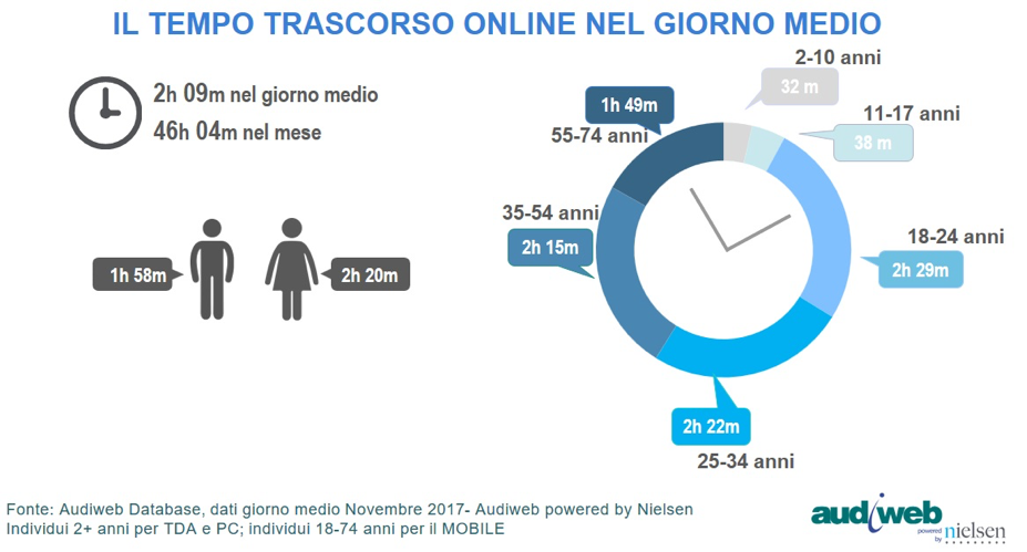 Infatti, ritroviamo i giovani dai 18 ai 24 anni con quasi 2 ore e mezza dedicati all’online nel giorno medio, seguiti dai 25-34enni online per circa 2 ore e 22 minuti e dai 35-54enni online per 2 ore e 15 minuti.
