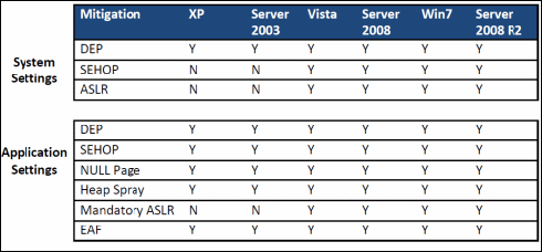 Non tutti gli interventi sono però applicabili su tutte le versioni di Windows. La tabella che segue (fonte: Microsoft), riassume quali tecnologie sono utilizzabili, facendo leva su EMET, nelle varie versioni di Windows: