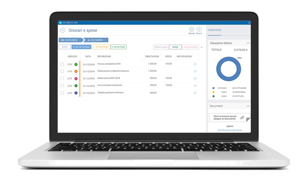 Dal dato anagrafico del nuovo cliente all’inserimento dei mandati, dalla pianificazione della fatturazione al controllo dello sforamento del forfait, dalla gestione di attività extra al controllo della marginalità anche per singolo servizio, il software contempla tutte le attività che il professionista deve monitorare per mantenere sotto controllo la sua attività, i suoi collaboratori e la soddisfazione dei suoi clienti.