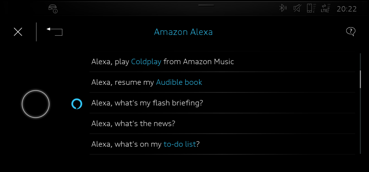 Audi ha integrato Alexa nel sistema MMI del SUV e-tron. Non c’è quindi bisogno di un’app sullo smartphone per usare l’assistente vocale, né di accoppiare il telefono con l’auto. Tutto ciò che serve è collegare l’auto al proprio account Amazon. È quindi possibile attivare l’assistente tramite il sistema di controllo vocale integrato pronunciando la parola “Alexa”.