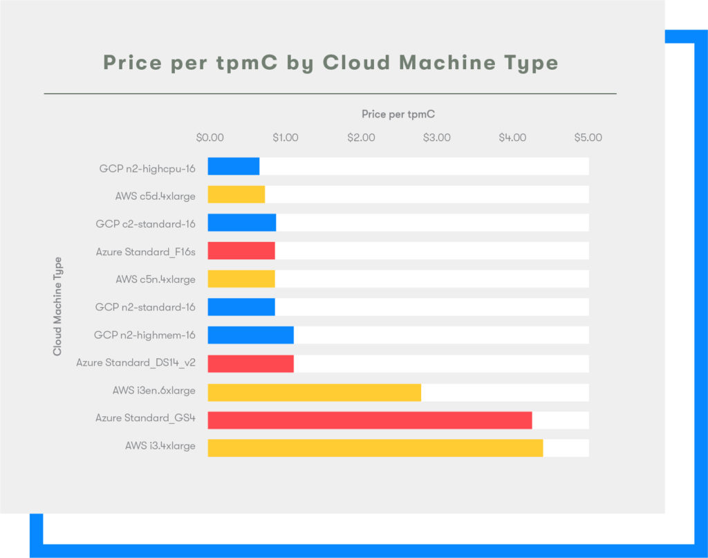 Anche qui, in ogni caso, i tre cloud si sono dimostrati vicini, sul prezzo più basso per tpmC. Tuttavia, quest’anno n2-highcpu-16 di GCP ha offerto le migliori prestazioni per dollaro nei tipi di macchine testate.