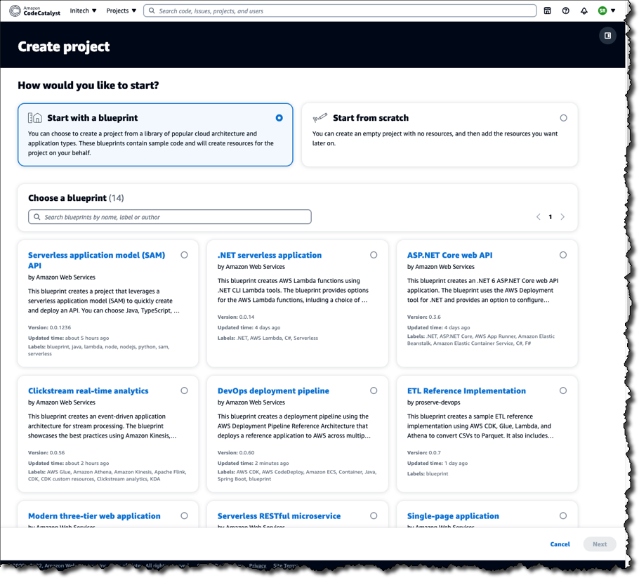 È possibile utilizzare CodeCatalyst per sfogliare una raccolta di blueprint di progetto, sceglierne uno per configurare rapidamente il progetto utilizzando la giusta combinazione di tecnologie, architettura, infrastruttura e servizi. Un blueprint di progetto effettua automaticamente il provisioning e configura gli strumenti di progetto, come un issue tracker o un repository di origine, imposta flussi di lavoro CI/CD eseguiti su un’infrastruttura di compilazione gestita e definisce l’architettura e la configurazione dei servizi AWS utilizzati dal progetto.