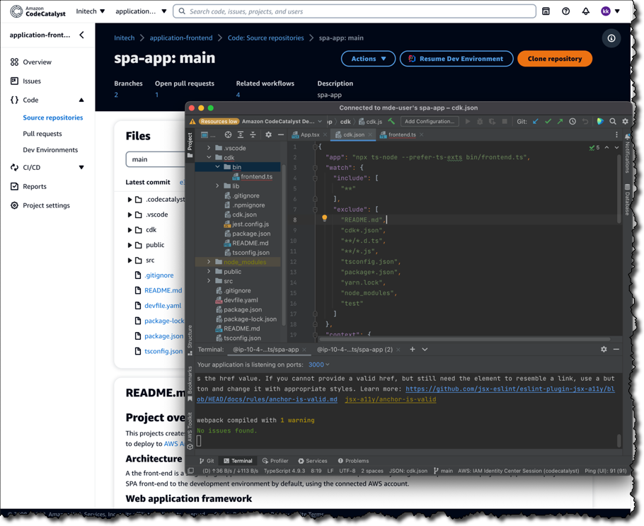 Gli sviluppatori che lavorano in ambienti di sviluppo basati su cloud forniti da Amazon CodeCatalyst possono utilizzare AWS Cloud9 come IDE, ma anche lavorare con Amazon CodeCatalyst da altri IDE sui loro computer locali, come JetBrains IntelliJ IDEA Ultimate, PyCharm Pro, GoLand e Visual Studio Code. Gli sviluppatori possono anche creare ambienti di sviluppo dall’interno del proprio IDE, ad esempio Visual Studio Code o per JetBrains utilizzando l’app JetBrains Gateway.