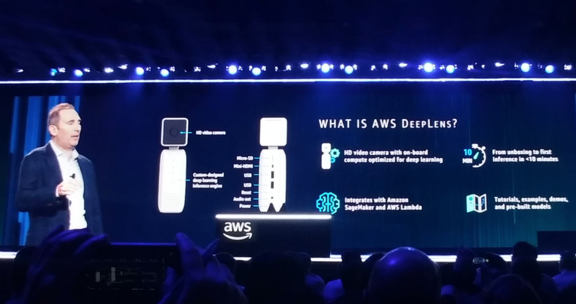 Diversi sono stati gli annunci che hanno riguardato l’intelligenza artificiale e il machine learning, “due ambiti – ha sottolineato più volte Jassy – che rivestono un ruolo di primaria importanza per AWS”. Ma forse quello che più ha colpito il pubblico è stata la videocamera DeepLens: si tratta di un prodotto espressamente pensato per gli sviluppatori con l’obiettivo di velocizzare la creazione di applicazioni in tema di intelligenza artificiale e Iot, potendo costruire progetti pre-configurati. Amazon la propone con in dotazione “template” in grado di eseguire il riconoscimento delle immagini, incluse espressioni facciali, cani e gatti e oggetti inanimati.