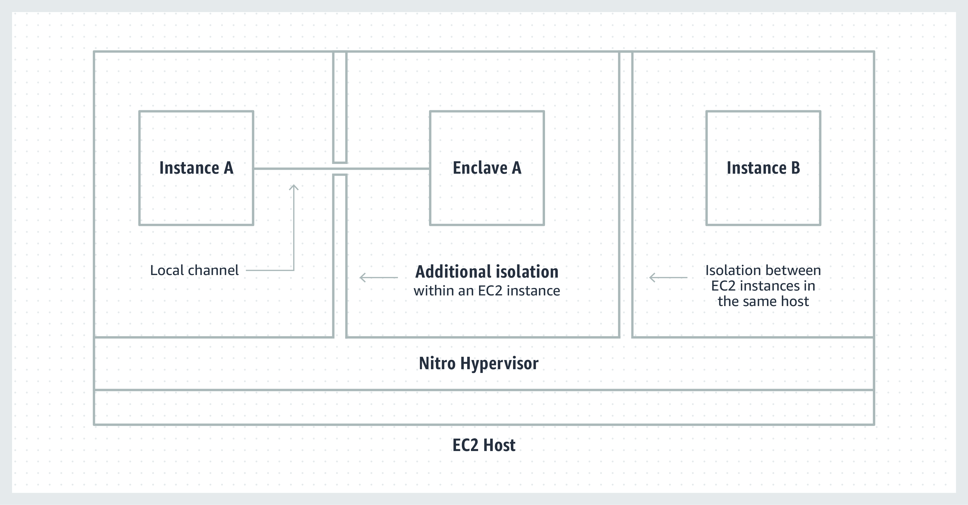 Ogni Enclave è una virtual machine creata utilizzando la stessa tecnologia Nitro Hypervisor che fornisce l’isolamento della CPU e della memoria per le istanze di Amazon EC2, ma senza alcuno storage persistente, nessun accesso da parte di amministratori o operatori e nessuna rete esterna.