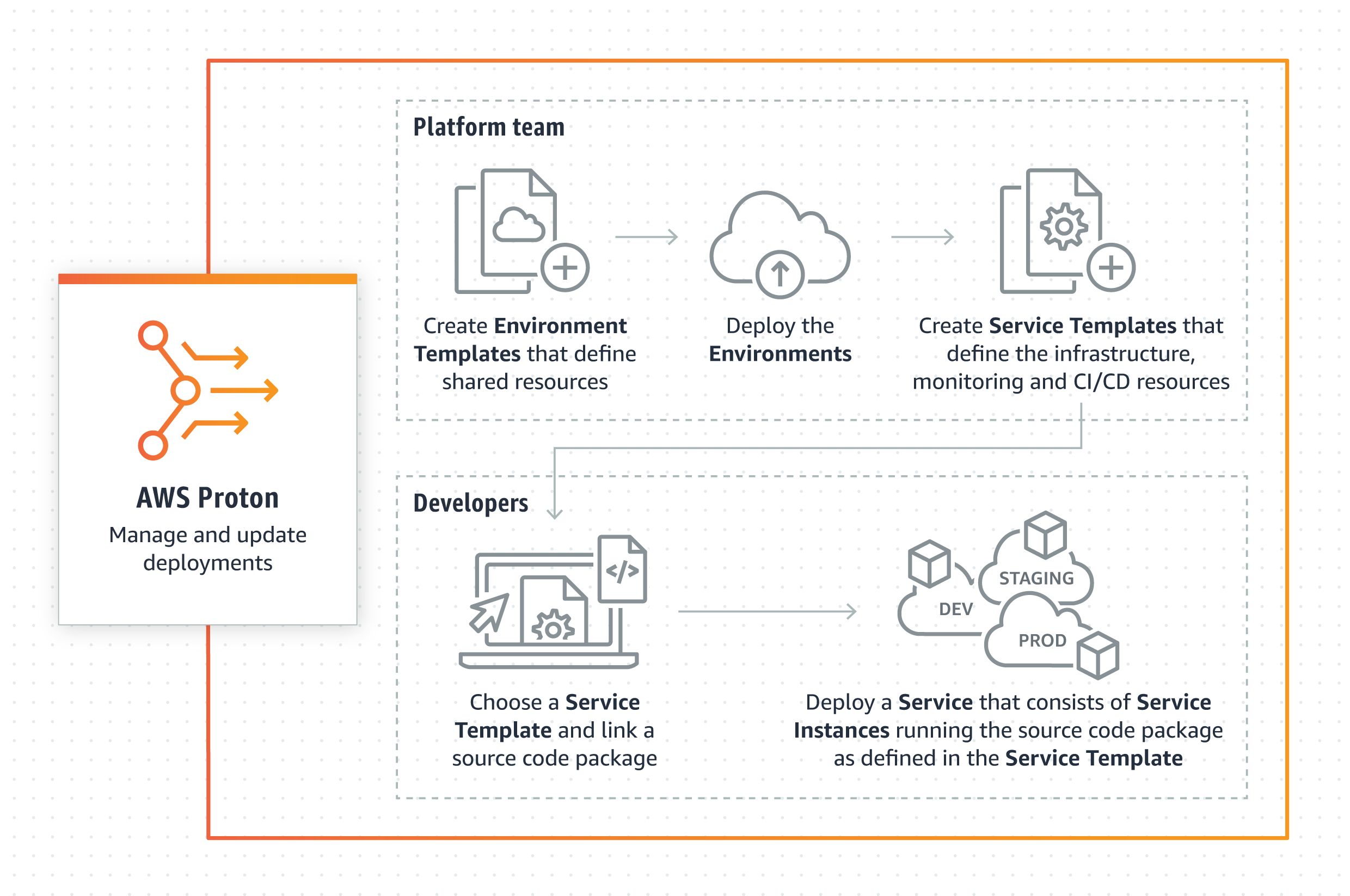 Con AWS Proton, i team dell’infrastruttura possono anche gestire facilmente i loro deployment di container e serverless e concentrarsi sulla creazione delle applicazioni, invece di passare ore a impostare l’infrastruttura per ogni team di sviluppo.