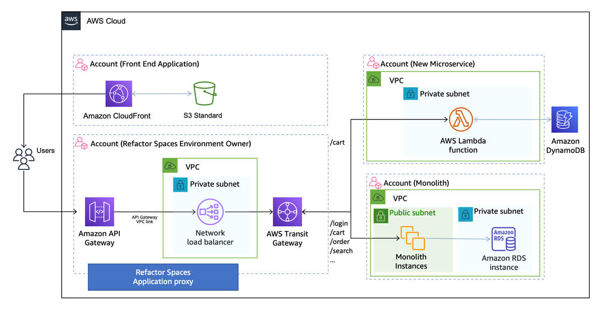 L’ambiente Refactor Spaces fa da bridge tra gli account Aws per permettere ai servizi vecchi e nuovi di comunicare mantenendo l’indipendenza degli account separati.