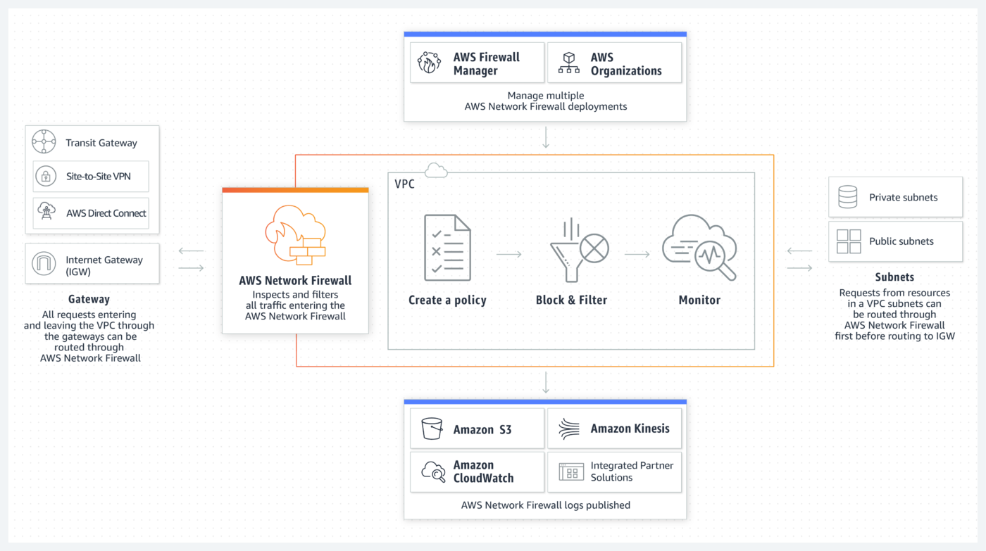 Il servizio consente di implementare e gestire le funzioni di stateful inspection, prevenzione e rilevamento delle intrusioni e filtro web per proteggere le reti virtuali su AWS.
