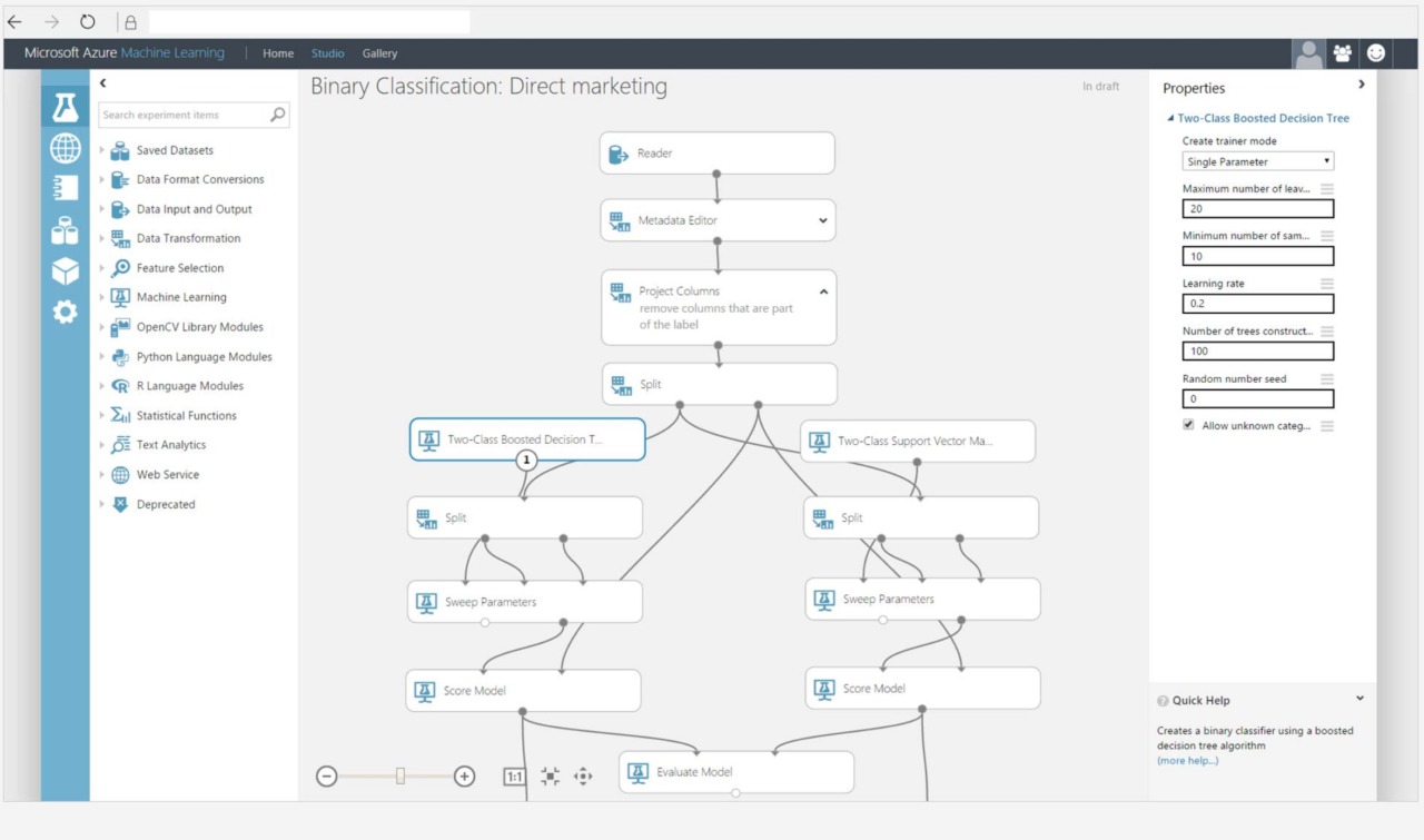 Azure Machine Learning Studio (o Azure ML) è un servizio di creazione di motori predittivi basato su cloud. A monte lo strumento consente di sviluppare modelli di apprendimento della macchina associando visivamente, mediante drag and drop, algoritmi e dataset (qui il tutorial).