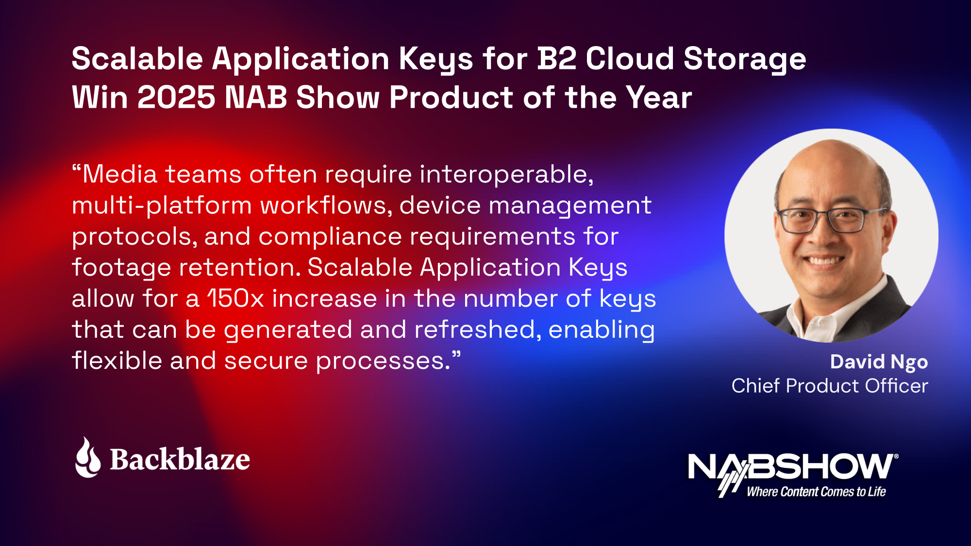 SAN MATEO, Calif.--(BUSINESS WIRE)--$blze #Cloud--Backblaze, Inc. (Nasdaq: BLZE), the cloud storage innovator providing a modern alternative to traditional cloud providers, today announced they were the recipient of the National Association of Broadcasters (NAB) Show 2025 Product of the Year Award in the Cloud Computing and Storage category for the Scalable Application Keys feature released for their Backblaze B2 Cloud Storage platform.