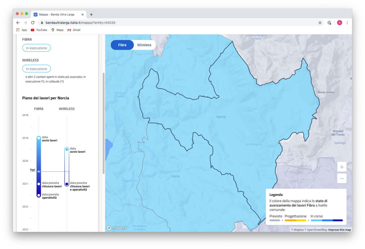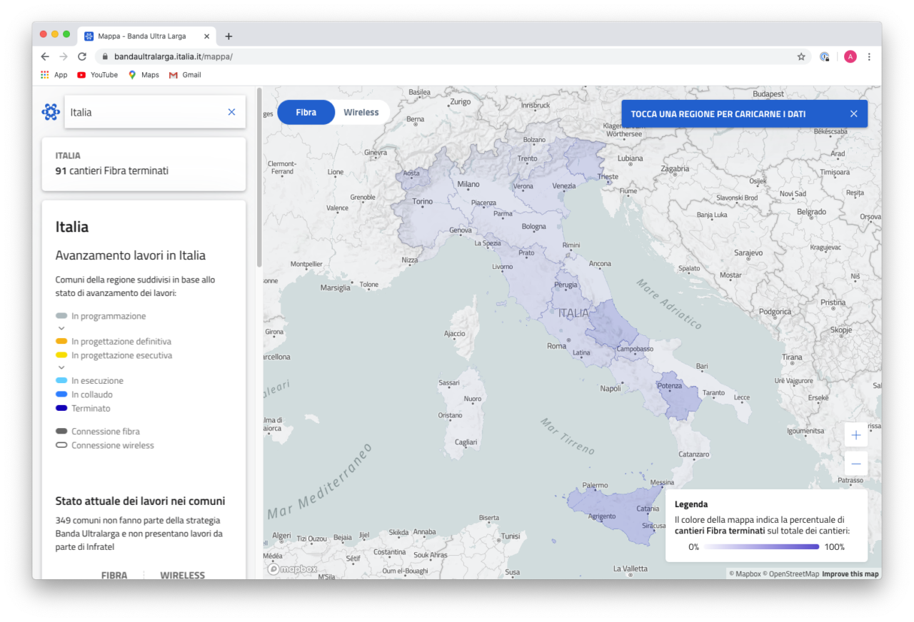 Le aree geografiche e i dati sono facilmente navigabili e presentano diversi livelli di aggregazione: Italia, singola regione e Comune di riferimento. L’utente può zoomare fino al livello del singolo comune per arrivare a visualizzare i dati di avanzamento dei lavori, per fibra o per wireless, per stato cantiere e per anno.