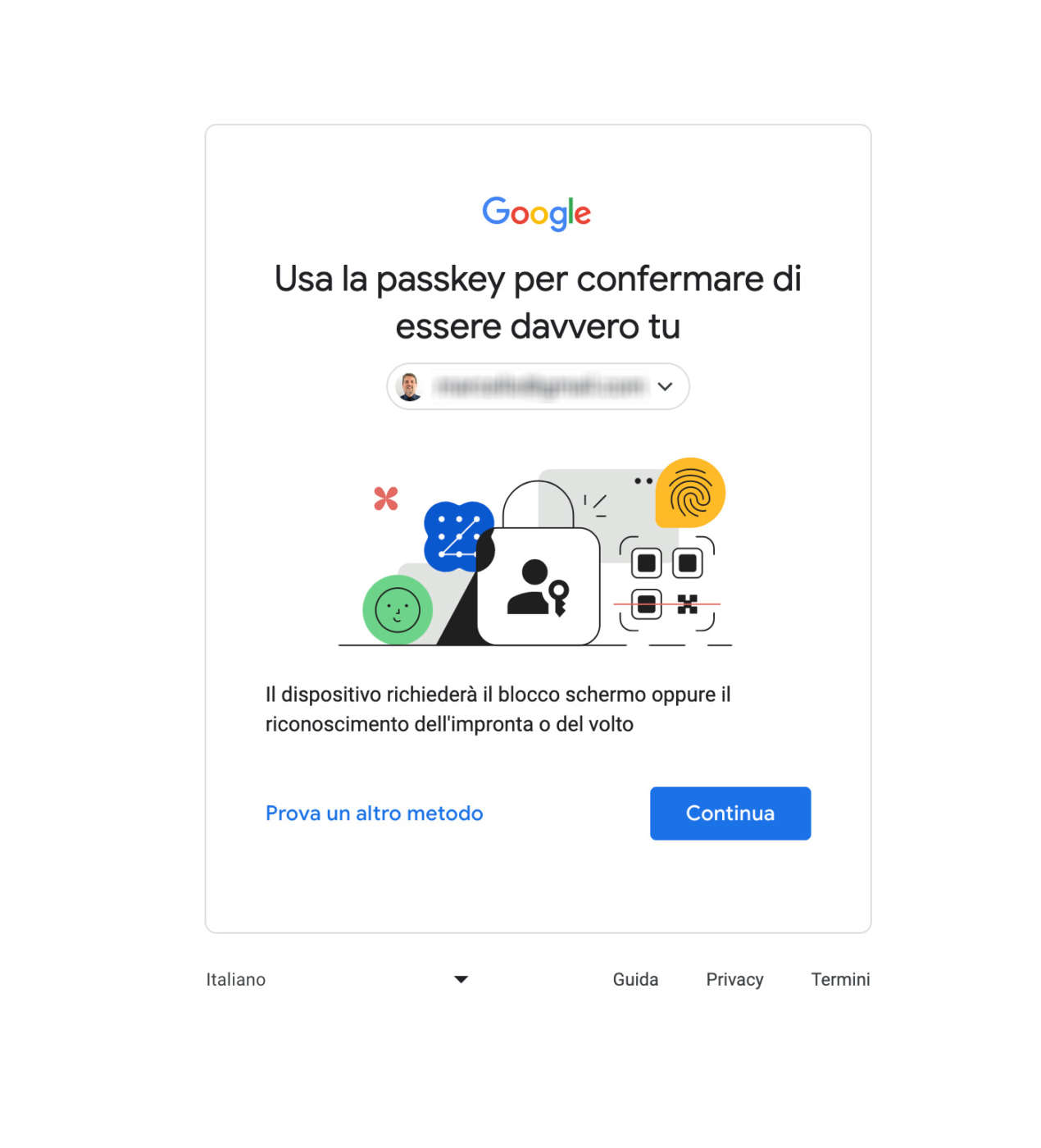 Quando si aggiunge una passkey a un account Google, verrà chiesta quando si accede o si eseguono azioni sensibili sull’account. La chiave di accesso viene memorizzata sul computer locale o sul dispositivo mobile, che chiederà i dati biometrici o il PIN del blocco schermo per confermare l’identità. I dati biometrici non vengono mai condivisi con Google o con terzi: il blocco schermo sblocca la chiave solo a livello locale.