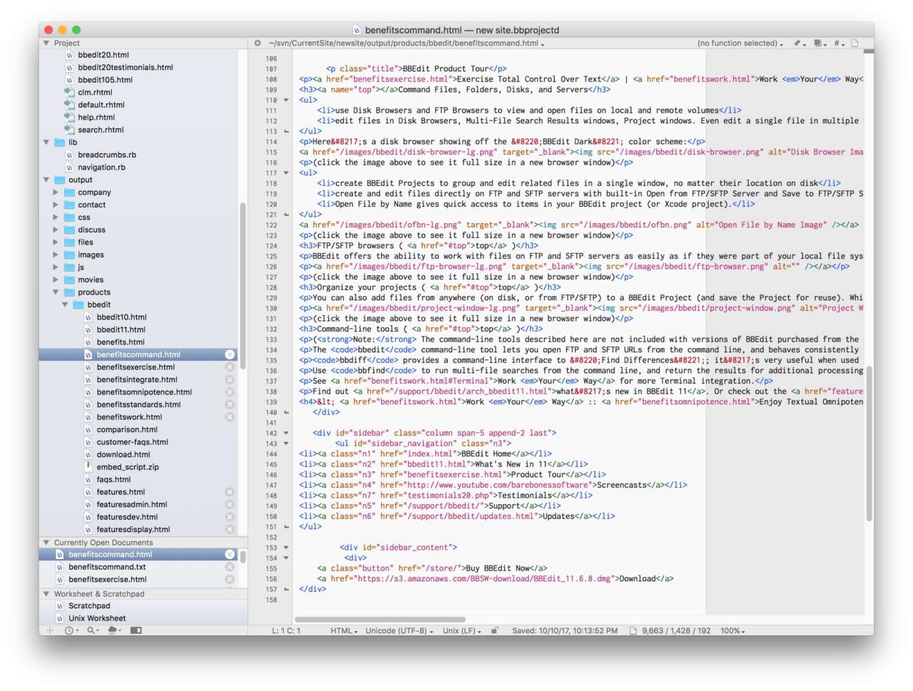 Tra le funzionalità generali del software, citiamo gli strumenti HTML per il veloce markup dei tag. O i potenti strumenti di manipolazione e trasformazione del testo. BBEdit offre anche sofisticate opzioni di ricerca, anche su file multipli e con pattern “grep”. L’app fornisce anche tool dedicati agli utenti Unix e ai System Administrator.