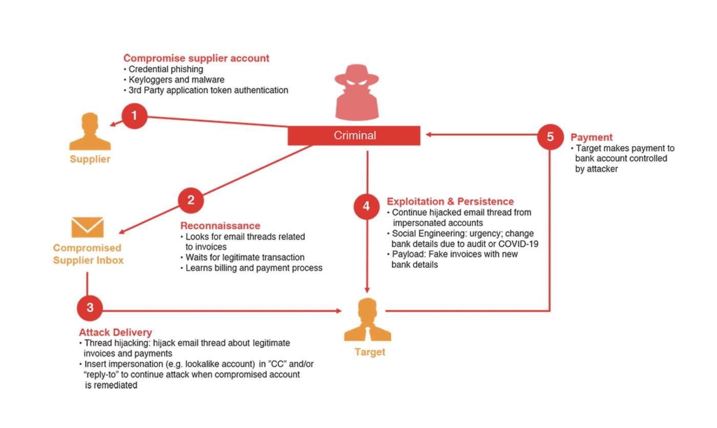 Se le truffe con le gift card sono relativamente semplici, utilizzando un’unica e-mail indirizzata a un solo dipendente, le truffe con i fornitori sono più articolate, implicano la compromissione e imitazione di partner fidati e si svolgono in più fasi contro più individui e organizzazioni.