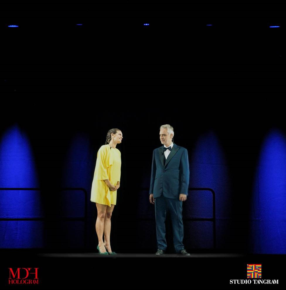 Durante la serata il compositore Giacomo Puccini, Andrea Bocelli e la moglie Veronica hanno dialogato in un intreccio tra virtuale e reale grazie agli ologrammi in 3D ad altissima definizione realizzati dalle aziende specializzate Studio Tangram e MDH Hologram.