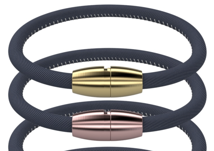 Il braccialetto di ffiber è disponibile in tre lunghezze: 17,5 cm 19,5 cm, 21,5 cm. Viene realizzato con finiture di silicone, pelle o jeans e acciaio o argento.