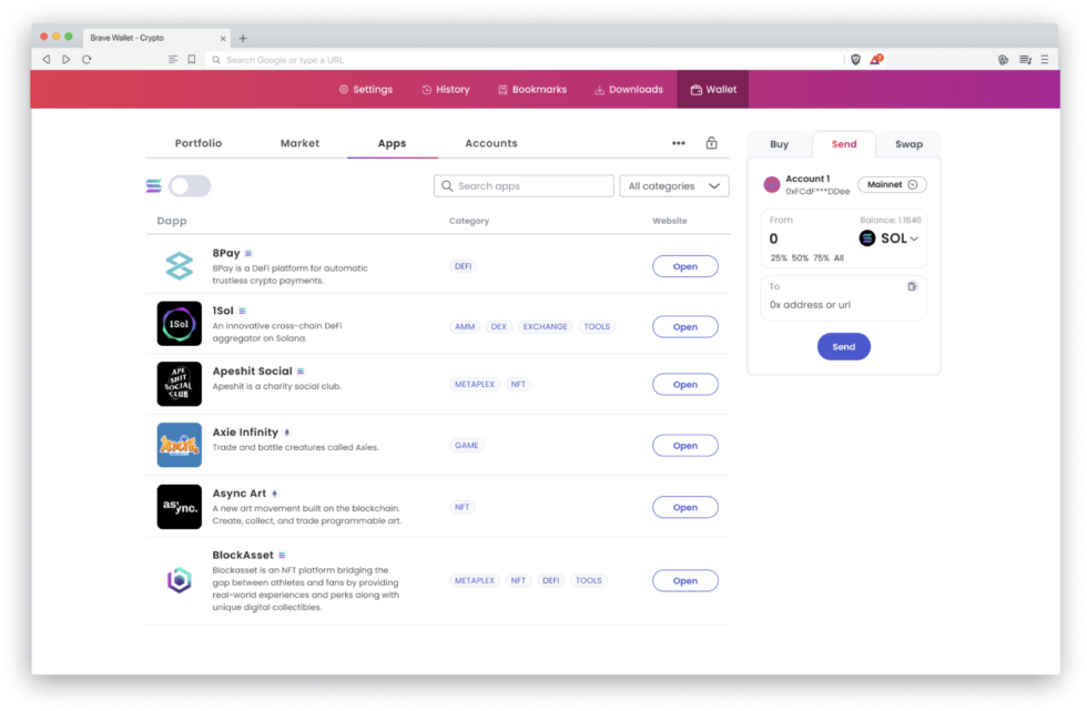 Brave Wallet consente agli utenti Brave di memorizzare, gestire, far crescere e scambiare il loro portafoglio di criptovalute da un unico wallet.