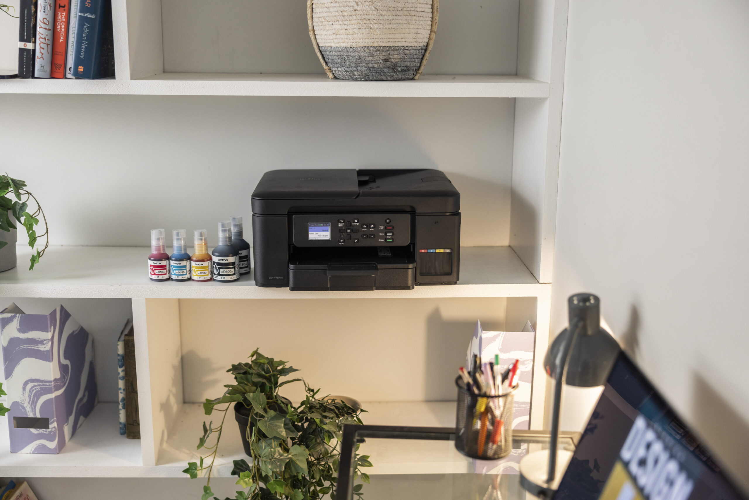 Il modello di punta DCP-T780DW può stampare fino a 15.000 pagine in nero (7.500 pagine per ogni flacone contenuto nella confezione) e 5.000 a colori. Questo sistema si distingue per la sua capacità di stampa, il vassoio carta integrato da 150 fogli e il design compatto.